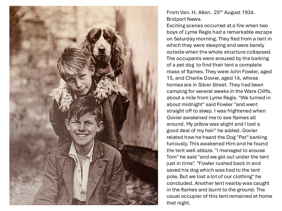 From Van. H. Allen. 25th August 1934. Bridport News. Exciting scenes occurred at a fire when two boys of Lyme Regis had a remarkable escape on Saturday morning. They fled from a tent in which they were sleeping and were barely outside when the whole structure collapsed. The occupants were aroused by the barking of a pet dog to find their tent a complete mass of flames. They were John Fowler, aged 15, and Charlie Govier, aged 14, whose homes are in Silver Street. They had been camping for several weeks in the Ware Cliffs, about a mile from Lyme Regis. "We turned in about midnight" said Fowler "and went straight off to sleep. I was frightened when Govier awakened me to see flames all around. My pillow was alight and I lost a good deal of my hair" he added. Govier related how he heard the Dog "Pat" barking furiously. This awakened Him and he found the tent well ablaze. "I managed to arouse Tom" he said "and we got out under the tent just in time". "Fowler rushed back in and saved his dog which was tied to the tent pole, But we lost a lot of our clothing" he concluded. Another tent nearby was caught in the flames and burnt to the ground. The usual occupier of this tent remained at home that night. |