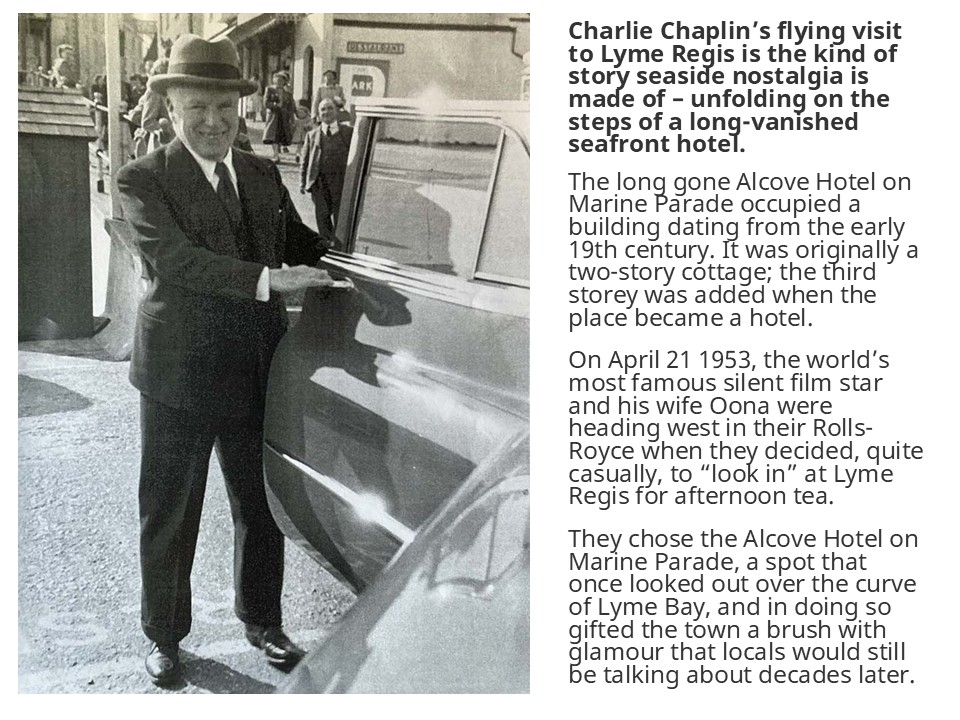 Charlie Chaplin’s flying visit to Lyme Regis is the kind of story seaside nostalgia is made of – unfolding on the steps of a long-vanished seafront hotel.The long gone Alcove Hotel on Marine Parade occupied a building dating from the early 19th century. It was originally a two-story cottage; the third storey was added when the place became a hotel.On April 21 1953, the world’s most famous silent film star and his wife Oona were heading west in their Rolls-Royce when they decided, quite casually, to “look in” at Lyme Regis for afternoon tea.They chose the Alcove Hotel on Marine Parade, a spot that once looked out over the curve of Lyme Bay, and in doing so gifted the town a brush with glamour that locals would still be talking about decades later. |