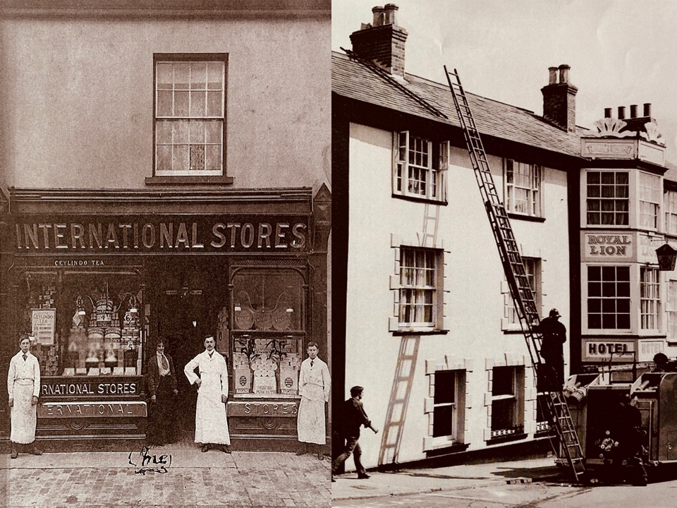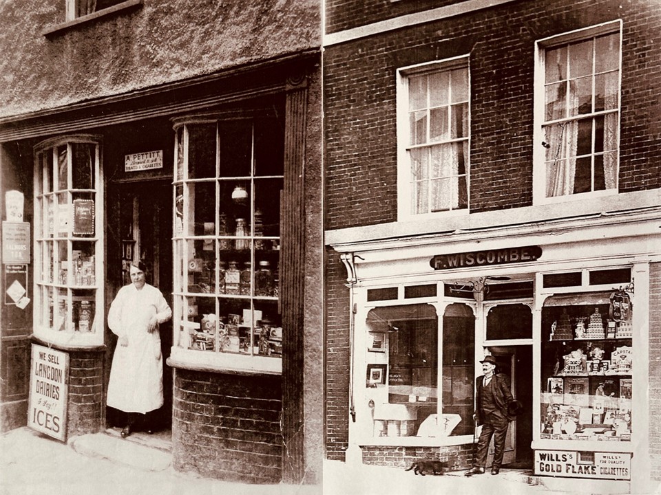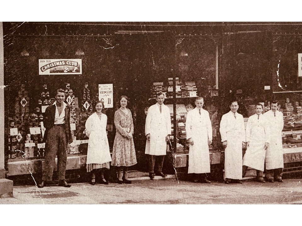 Jack Tracey, Florrie Legg, Ruby Ebdon, Jack Rogers (Manager), Ivan Long, Eglow, Edgar Harris and Fry outside the Star Supply Stores, Lyme Regis in 1931 in Broad Street. Star Supply Stores (originally the Star Tea Company) was a major British grocery chain with over 300 locations by the 1920s. |
