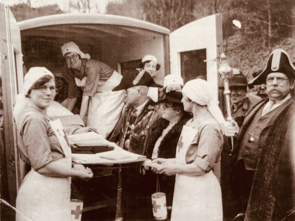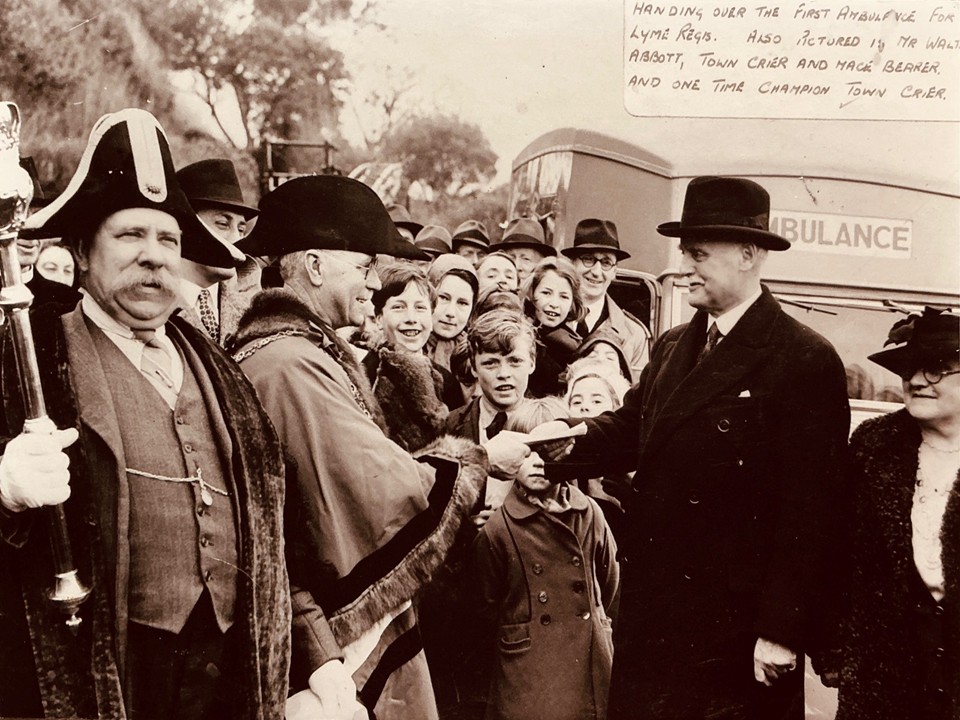 Handing over the first Ambulance for Lyme Regis with Walter Abbott, Town Crier. A photograph of Lyme Regis from the Keith Wiscombe Collection. |