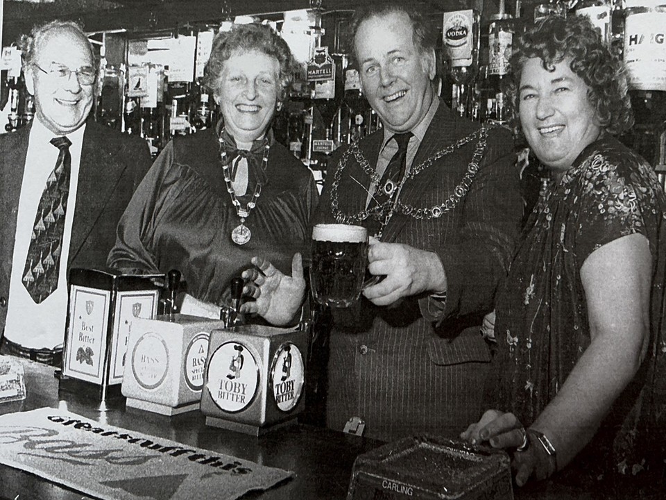 Charles Chipperfield, Sheila Appleby, Dennis Appleby (Mayor) and Mary Chipperfield at the London Inn in 1981. Lyme Regis. |