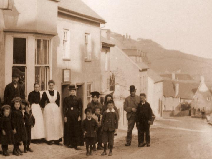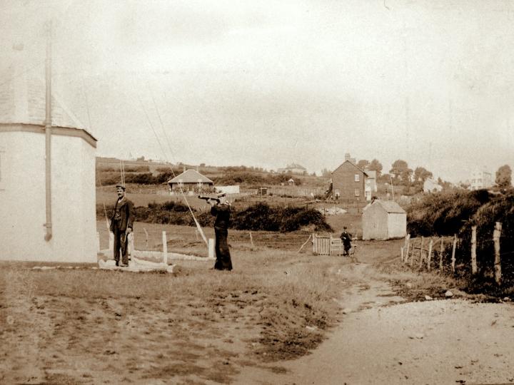 principally as a base for Excisemen working against smuggling.This photograph shows some of those who were stationed there. In the background is the Battery where the ammunition for their guns was kept. The spot is now the entrance to Thalatta in Higher Sea Lane. |
