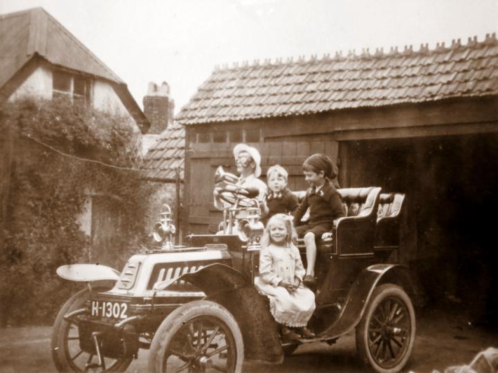 The first motor car in Charmouth was a De Dion Bouton which was owned by Sir Cecil Harrison. It is seen here outside the Coach House on the Knapp. At the wheel is Arthur Harrison, with other members of his family. |