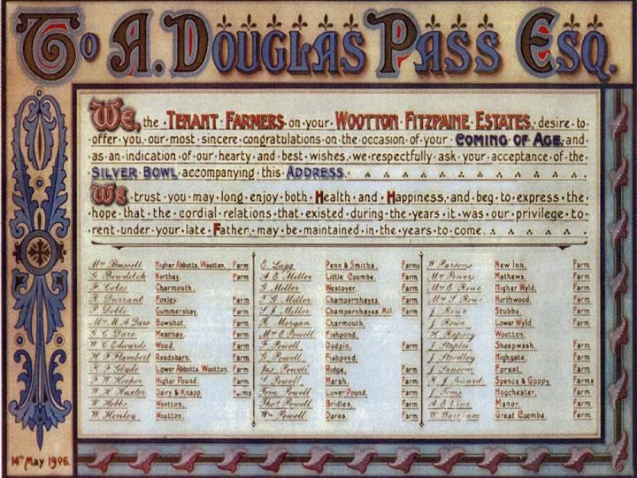 This slide records the tenant Farmers and Household staff presentation of a Silver Bowl on Alfred Douglas Pass becoming the new Lord of the Manor in 1906 when he was just 21. The Long List of tenants included Robert Morgan who was renting Charmouth Stores and Frank Coles the Bakers from him as well as many of the farms in the area. |