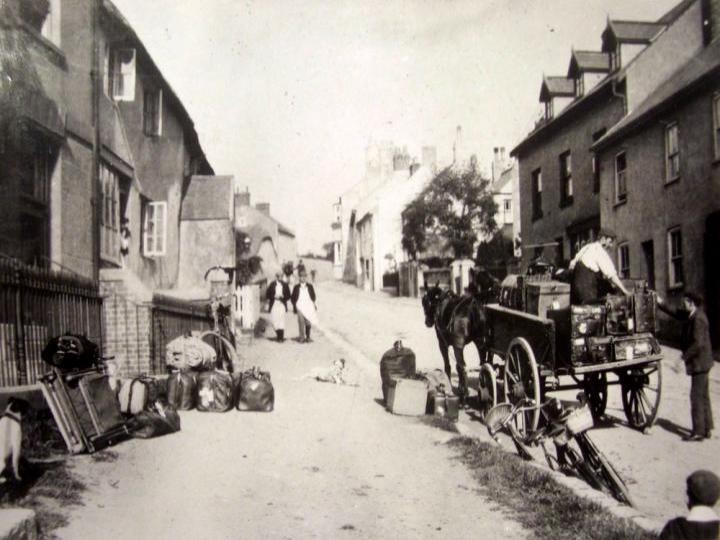 | In his notes on the village, Reginald Pavey writes:"At the turn of the 19th century Visitors arrived and departed either by Holly’s Bus or by The Coach and Horses Break. Their luggage was conveyed to and from the station by wagon. There were no boarding houses and families either took a furnished house and bought their own servants or stayed in lodgings. They usually came for a month or six weeks. The same people came year after year and knew everybody. In the morning after bathing “Top and Run “ was played on the West Cliff, an annual institution until Thalatta was built and the pitch built over. Nearly everyone joined in. In the afternoon was there Tennis at the Club and occasionally a cricket match on which the visitors helped to strengthen the team. Once a year the Ladies played the Men, which was quite a social function". This photograh shows one of these wagons being loaded outside Claremont at the top of the Street |