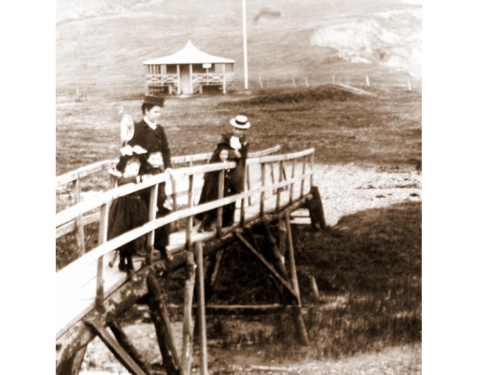 In 1897 Queen Victoria was commemorated by the construction of “The Jubilee Shelter”. It had formerly been the building used to store the ammunition for the Volunteers but was adapted by adding a roof and balcony around it, as can be seen in this photograph of the timber bridge that went over to the island where it stood. |