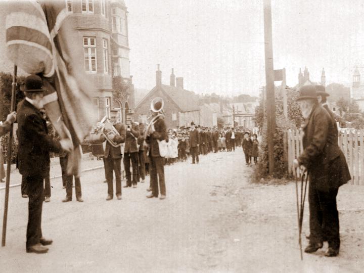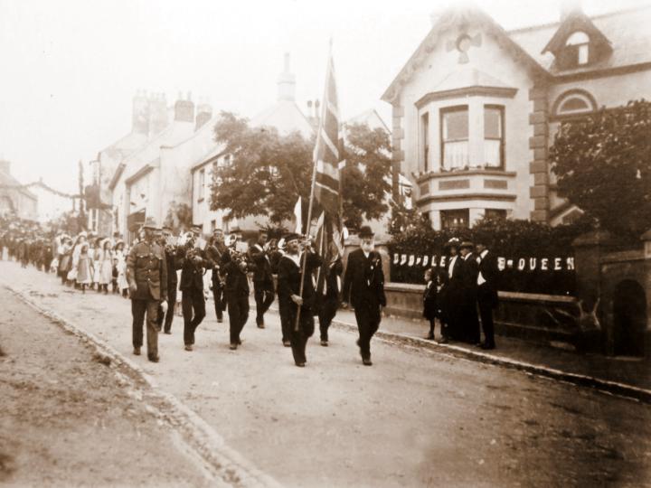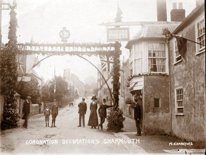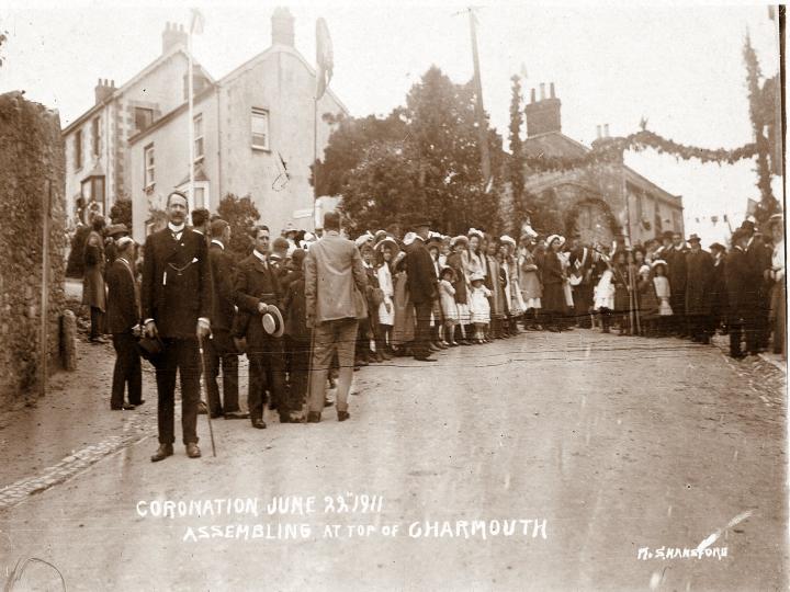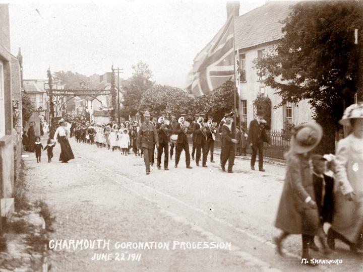| At the beginning of the 20th century Samuel, the father of Barney Hansford would take superb photographs of Charmouth and the surrounding villages. Amongst these were some that were produced as postcards to commemorate the coronation of King George V in 1911.There follows just a few of the lively procession down The Street which provide a marvellous record of Charmouth at that time. |