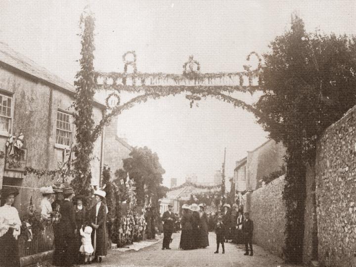 The people of the village of Charmouth had prepared a lofty triumphal Arch of oak bought, with a crown of Laurel and wreaths of flowers." . |