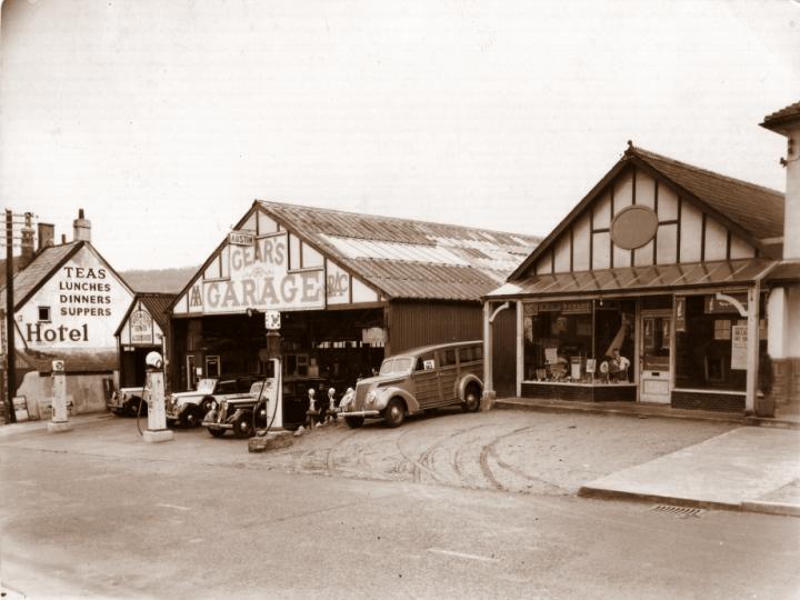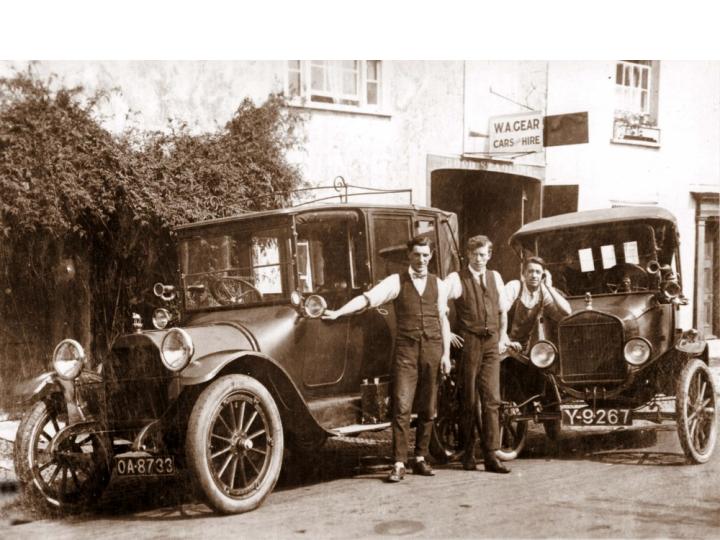 | After the First World War, Billie Gear opened his first garage in the stables of the George. He is shown here with his workmen proudly standing by his vehicles. |