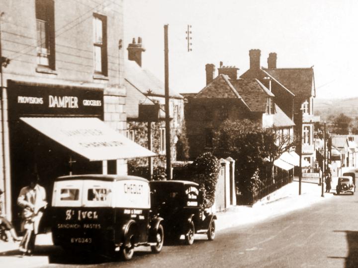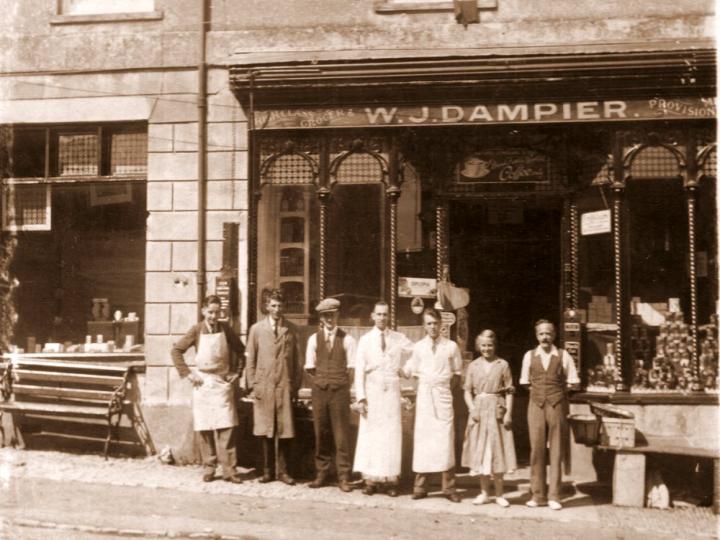 | William John Dampier moved from Dorchester where he worked for the department store of Boons and Sons to Charmouth in 1918 and took over the Stores which his family continued to run until the year 2000.This photograph from 1935 shows William on the right with his staff and son Donald who was to take the store on after his father. |