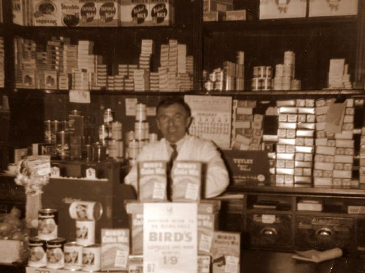 | This is a view of the inside of their shop with Donald Dampier, father of Ron behind the counter of Charmouth Stores taken in the 1950`s. |