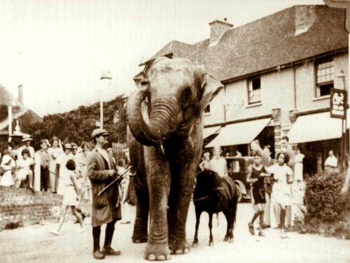 | This astonishing photograph shows an elephant from a visiting circus outside the shops, soon after they were built. Earlier in 1929 the village made the national news when a Lion escaped from a Circus Car when it hit into a tree just outside the village. It roamed the fields for a time and attracted large crowds. It went on to seize one of the cows there and sadly was shot dead by a marksman. |
