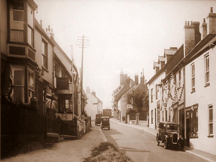 | The flags are flying at the top of The Street in 1945 when peace was declared. Many shops existed at that time including a Post Office and Grocers. |