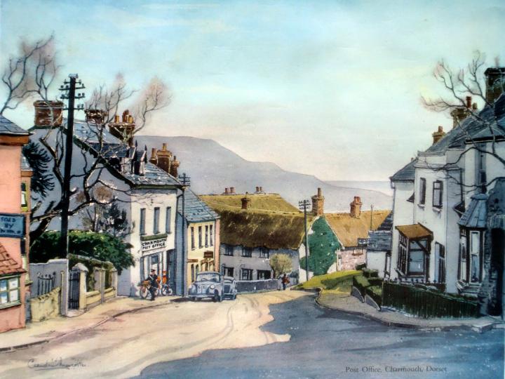 | This painting by Claude Muncaster shows the "Charmouth Post Office" on the left which was run by the Longs,as a general store. Immediately up from the shop was Askew House set back from the road, which for a long time was the Charmouth Surgery run by Dr. Chamberlain. The building with the Sold sign was once a Fish shop run by James Gear. As well as a number of businesses there was the "New Inn" a little further up if you felt like a drink, now sadly gone. |