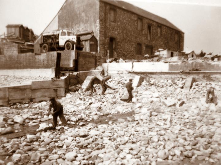 | During the spring of 1954 severe gales so damaged the concrete walls of the Car Park that they had to be entirely rebuilt. Here are some of the workmen outside what was to become the Heritage Centre. |