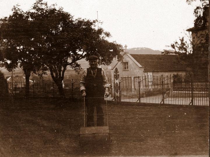 | This photo shows a gardener cutting the lawn of Charmouth Lodge. In the distance can be seen Pryers Stone Masons ofices, which is now The Pharmacy and to the right is Sandfords which was demolished in 1958 to widen the access to Lower Sea Lane. |