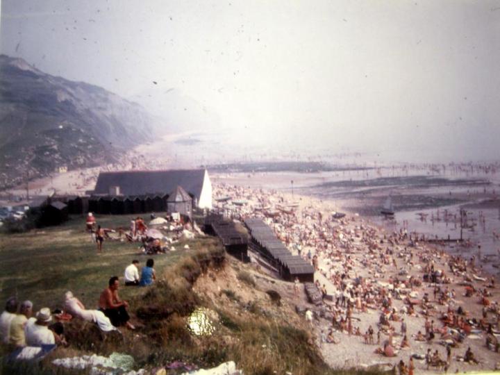 | This is Charmouth Beach in the summer of 1968 which shows how popular it was. At that time the police would stop people driving down Lower Sea Lane after the car parks were soon filled up in the morning rush. |