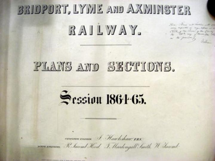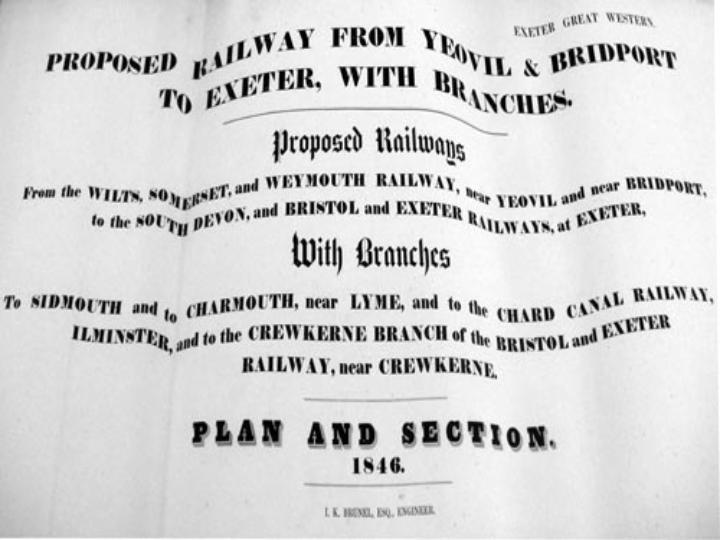 In 1846 the famous engineer, Isambard Kingdom Brunel proposed a Railway to Charmouth and drew up plans whose frontispiece is shown in the slide. It is the first of many schemes that are all later abandoned. |