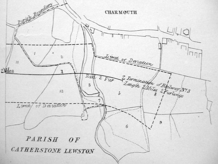 | The Bridport, Lyme Regis & Axminster Railway Company Map showing the Charmouth section and its proposed station with access from Barrs Lane. |