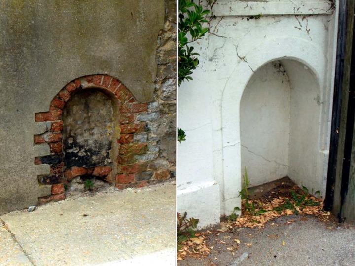 | This slide shows two of the places on the Street which still have the brick insets in their walls where the stand pipes and taps were available to take the water from. |