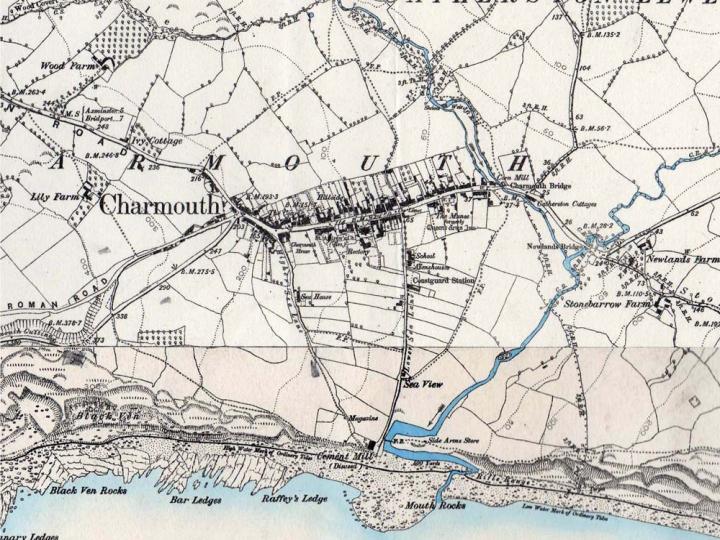 | In 1806 Colonel Mudge of Ordnance Survey produced the earliest surviving map of Charmouth, though there is a long lost map dating back to 1783 by James Upjohn of Dorchester whose detailed record book was transcribed by the historian, Reginald Pavey. |