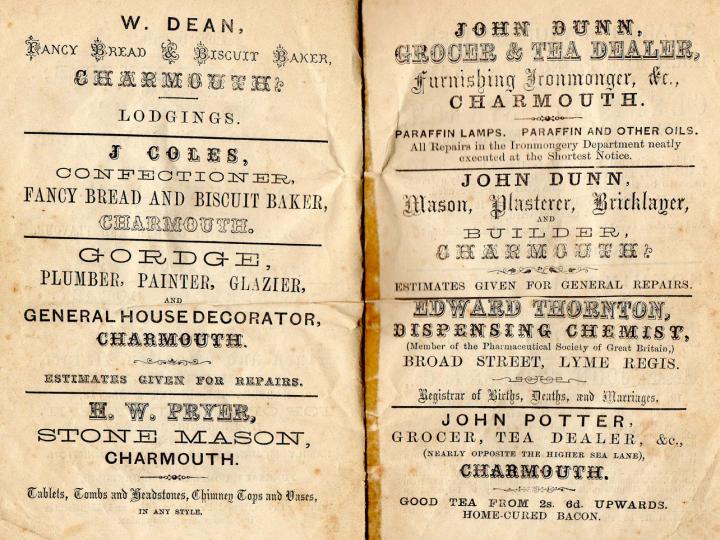 In 1865 John Wellman who had a shop in what is now Rupert House, near Nisa, produced his "Guide to Charmouth and Its Neighbourhood", which provides valuable information about the village at that time. There are a number of adverts that includes John Potter who had a shop opposite Charmouth House. |