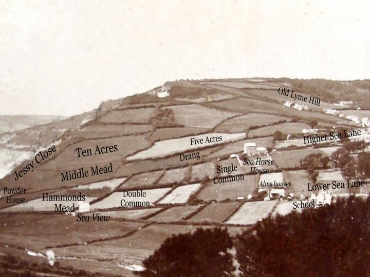 | The fields between the Street and the Sea were known as Common land and the mediaeval strip farming would have operated there. This photograph from 1890 shows these fields clearly marked out before they were built on in the following century. The fields known as Hammonds Mead, Five Acres, Single and Double Common denote areas of the village today. |