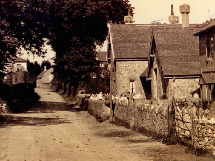 | The foundation stone for the new school in Lower Sea lane was laid on 26 th August 1869 by Mrs Breton, the Rector's wife. All the shops in the village closed for the day to celebrate. On the right cab be seen the newly built Almshouses. In the distance The building with a stone cross on its roof was the workshop of Pryers who were Stone Masons and is today the Pharmacy. To the left of the lane was Sandfords which was later demolished to widen the Lane. |