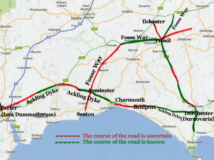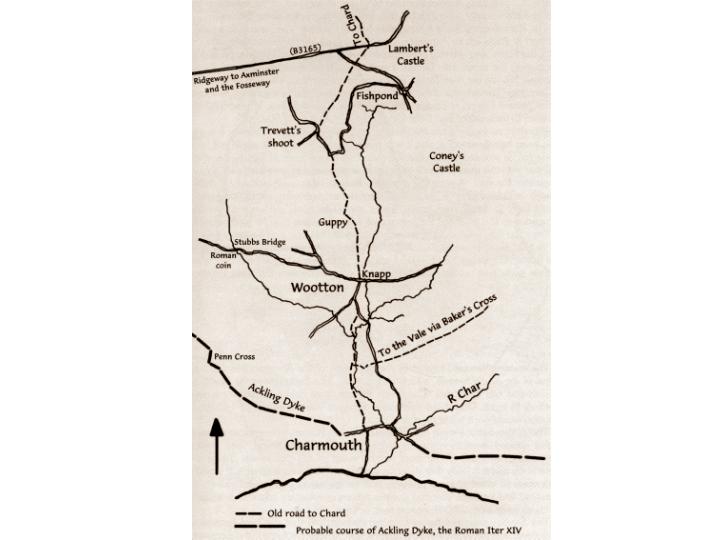 | This was known as the Ackling Dyke. Another road in the area was the Fosse Way that ran from Lincoln to Exeter and a port near present day Seaton. Both routes crossed near Axminster and were controlled by a Roman fort at Woodbury Farm, on the southern edge of the town. There are still discoveries to be made by the archaeologists to substantiate this completely, but the recent excavation of a section of it nearby at Hogchester Farm adds to this knowledge. Further evidence of Roman settlement was found at Holcombe in Uplyme where a Romano British farm was revealed. The present day Street may well be a length of this ancient road which originally descended from Stonebarrow. |