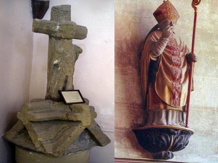 | Another link with Forde is the statue of an Abbot in the Church,which was originally on the outside of the old church, alongside is a similar model of how it may have once looked. |