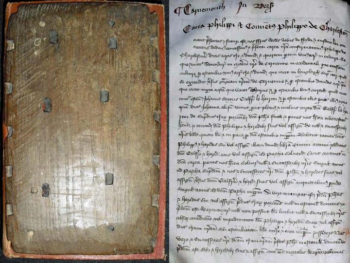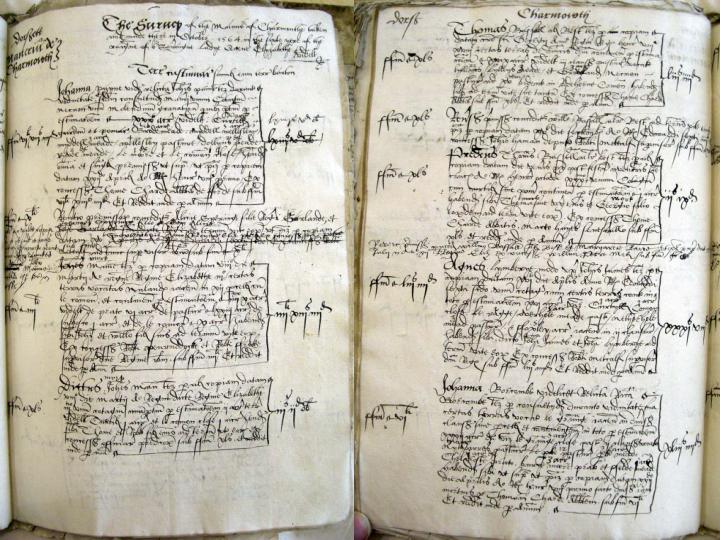 "Grant by brother William, abbot of Forde, desiring to improve the manor of Charmouth (Cernemue), that the vill of Charmouth shall be a free borough within the following bounds: on the east side of the vill all that place called Sevenaker by the water below the road from Charrereystone up to the road between Charmouth and Bridport, then along the watercourse which runs to the monks' mill; from there along the course of the river to the sea and to the chapel of the vill; thence along the road ascending to le pillory and then to the cross which stands on the road to Lyme above Radehorne; on the west side of the vill as far as le Sheote by the corner along the ditch to the bank adjoining Sevenaker on the north side.
