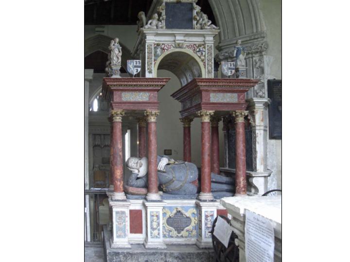 | This is the impressive monument to his father and mother,whose effigies appear back to back at the Church in Colyton which was erected by Sir William Pole. |