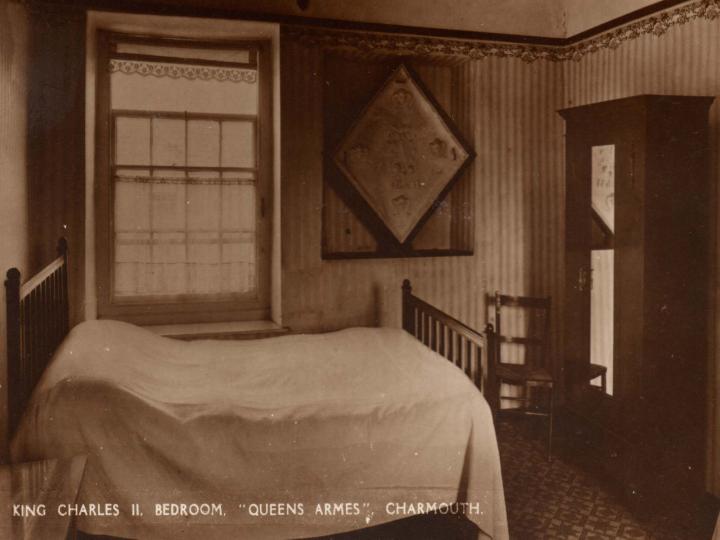 | This shows the room in the house where the King is supposed to have stayed.The diamond shaped plaque on the wall, was originally above a fireplace and commemorated the restoration of Charles II in 1660. |