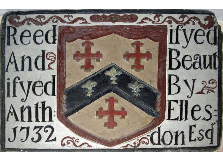 We are fortunate today to have two Impressive memorials to Anthony Ellesdon in the Church which both record what a splendid man he was in spending some of his considerable fortune on remodelling the church in 1732. There was also a fine Silver plate with his coat of Arms on it at one time, but was latee sold.