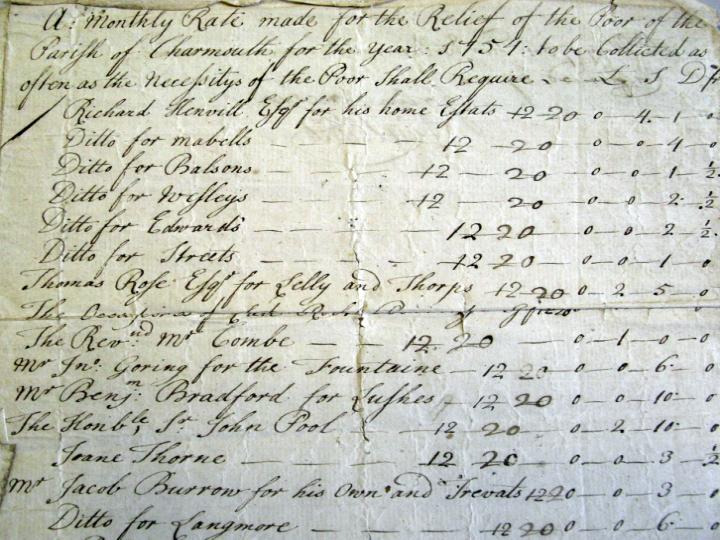 | Whereas the 17th century had been a time of poverty for the villagers, based on its land and absentee landlords. The 18th century marked a time of change and increasing prosperity. We are fortunate that a Poor Rate list from 1754 has survived. It shows although Richard Henvill, as Lord of the Manor was by far the largest landowner, but other gentlemen are listed paying substantall rates.We can pick out: Thomas Rose for Lily Farm, Reverend Combe for Church Lands, John Goring for The Fountain Inn, Benjamin Bradford for Lushes (Foxley Farm), Jacob Burrow for his own and Langmore Farm. It is interesting to see that Sir John Pole of Shute, still owned a farm here.