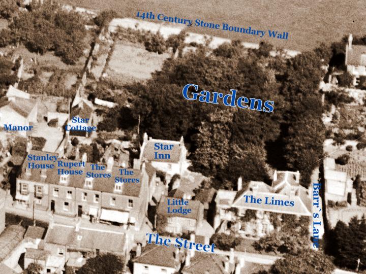 | An aerial view today showing the boundary wall still in evidence especially to the north of The Street. |