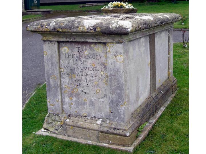In 1789 James won an action against the Rev. Brian Combe and others for removing sand and seaweed from the beach which he owned. His arguments climaxed with a disagreement with a neighbour, Norman Bond that resulted in a duel at Hunter's Lodge Inn with James being shot through the heart and the neighbour fleeing the country to Barbados. The episode is recorded on the large tabletop tomb to James Warden near the entrance to Charmouth Church. |