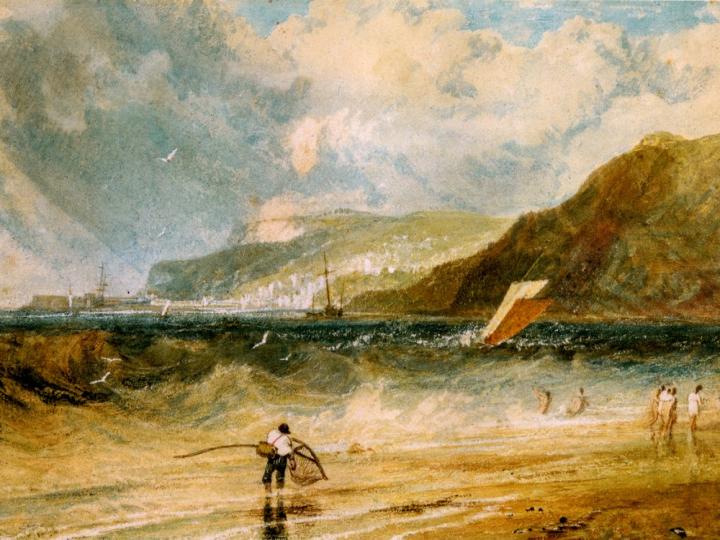 | Britain's greatest artist - J.M.W.Turner visited Charmouth in 1811 and painted this beautiful view of a squall looking towards Lyme Regis,which now hangs in the Kelvingrove Gallery in Glasgow. There are 3 drawings in his sketchbook which records the village in that year. |