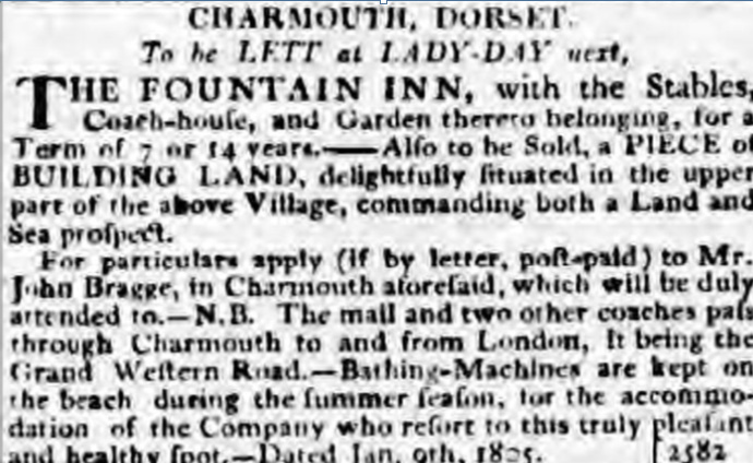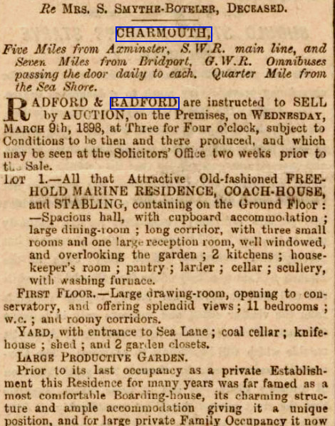 Mr Holly of the Coach and Horses Hotel has purchased the residence situated at the top of the village, known as Charmouth House, occupied some years ago by Squire Gordon, which the purchaser intends converting into a hotel. It is rather remarkable that the premises in by gone times was used for a similar purpose, the name of the hostelry being the Fountain, we understand that remnants of the ornaments a bunch of grapes which advertised the entrance 70 years ago are still hanging in one of the stables. As our readers are well aware Mr Holly, whose fame as a landlord is widespread, has occupied the Coach and Horses for a very long period, which dates back far into the coaching days of old. The premises mine host has now purchased are very pleasantly situated and exceedingly commodious. The cost of the property purchased by Mr Holly, which in addition to Charmouh House, consists of several cottages, and about 5 acres of land (including Fountain Mead is £1560.