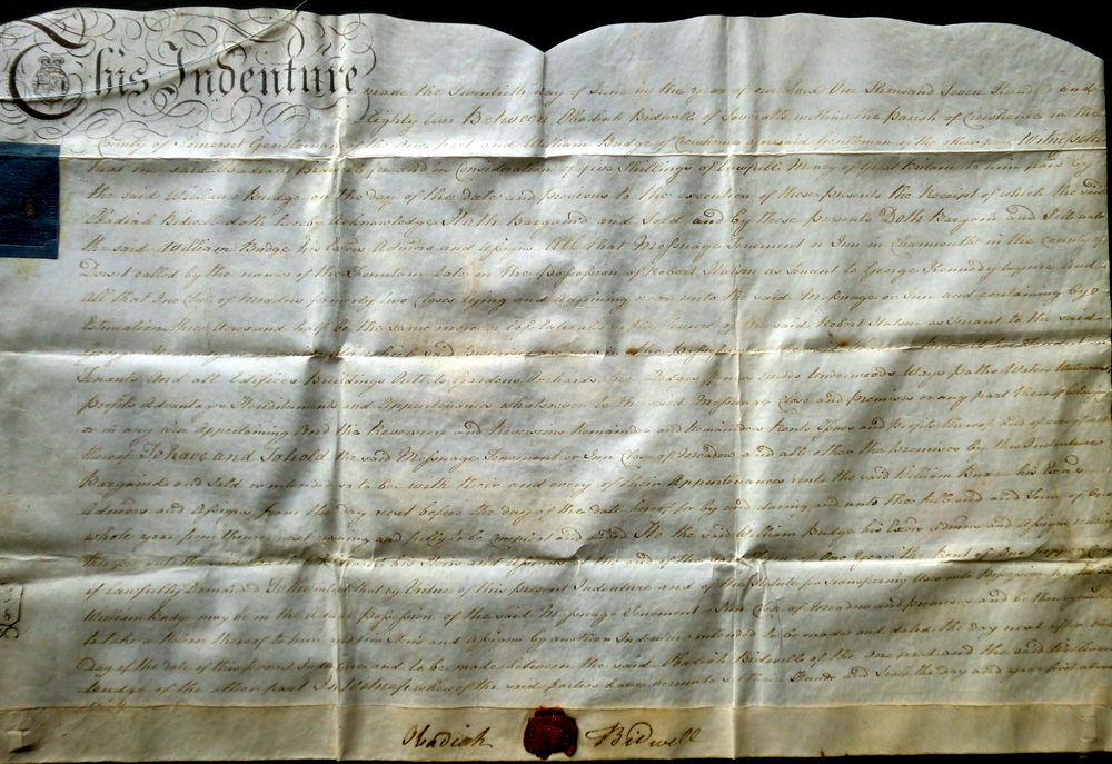 The next important family to own the Fountain were the Burridges, who were Mariners and featured prominently in the history of neighbouring Lyme Regis. They were to become Mayors and Members of Parliament for the town. A lasting memorial is the large black slab recording various members in the entrance to the Church including Robert and his sons John and Robert. In 1654 John Lush marries Joan Lymbry at Charmouth, whose descendant Arthur Lush, a shoemaker is shown as the owner in 1689. The following year he in turn sells it to Robert Burridge of Lyme Regis. The family were Dissenting Merchants and though Robert was removed as Mayor in 1684, they held the office 7 times between and his brother John was M.P. for Lyme Regis in 1689. The Burridges traded with Virginia and Barbados during this time and their large accounts book for their many trips can still be seen in the Dorset Record Office. By the 18 th Century the family were involved with the Slave Trade. They were to live in a large House on Broad Street in Lyme Regis and let the Fountain Inn to various tenants. The Deeds to Charmouth House show Robert leaving the Inn to his sons Robert and John.