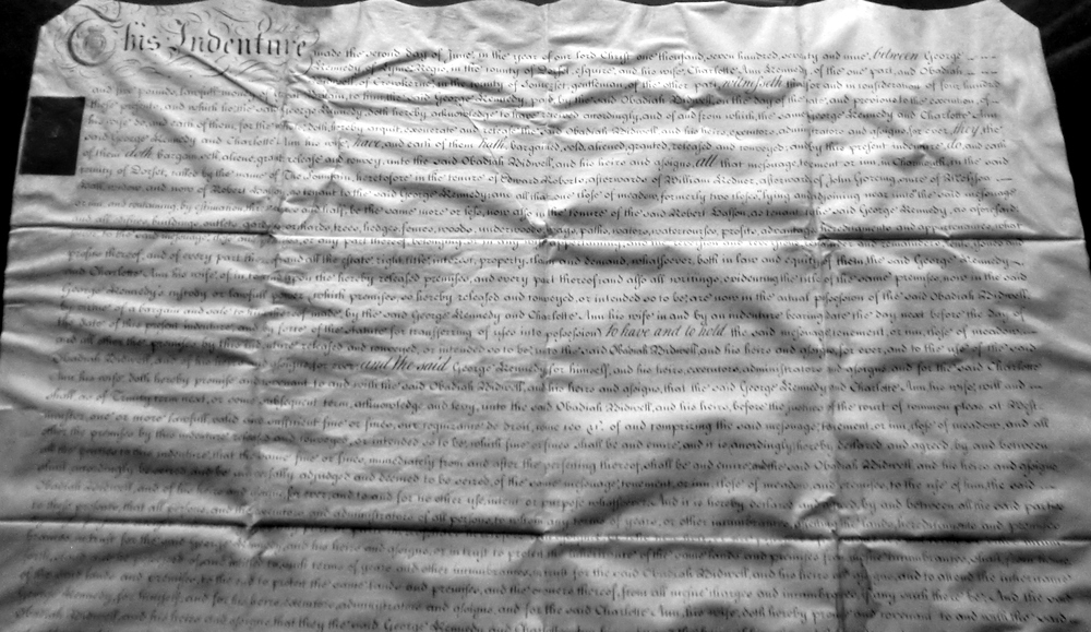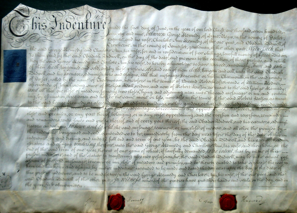 Three years later he sells it on to Obadiah Bidwell, the original document of which now hangs in the Pavey Room at The Elms. It details that George Kennedy of Lyme Regis, Charlotte Anne, his wife and Obadiah Bidwell of Crewkerne paid £400 in the Tenure of Edward Roberts, afterward William Rednor, afterwards of John Goring since of Melissa Wall, widow now of Robert Halson as tenant to George Kennedy and that Meadow, formerly 2 in the tenure of Robert Halson. The original advertisement from the Sherborne and Yeovil Mercury for 1774 can still be seen in the Dorset Record Office.