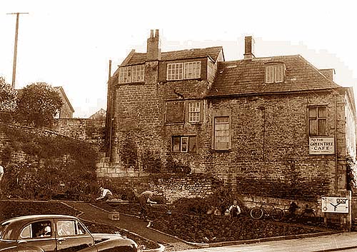 | The Gardens in the 1950`s with the side of the Liberal Club before retoration and signs of the weavers workshops on the top floor. |