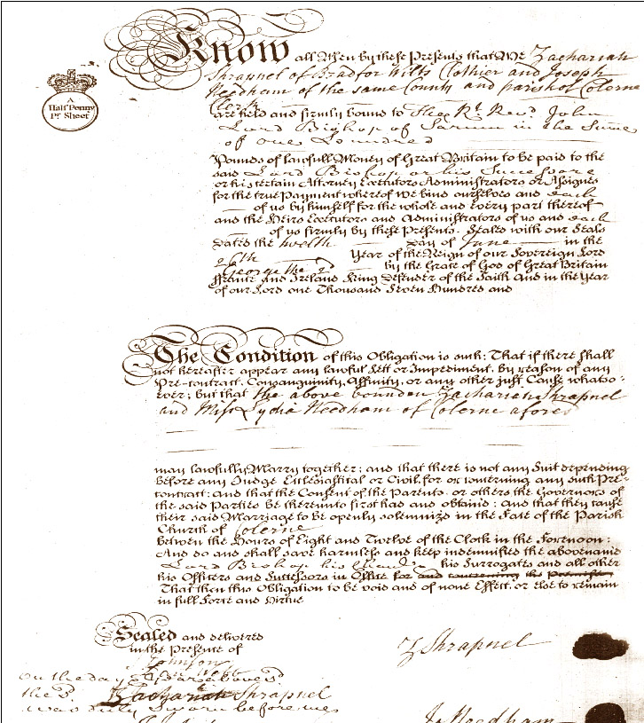 Marriage License foe Zachariah Shrapneell and Lydia Needham in 1753