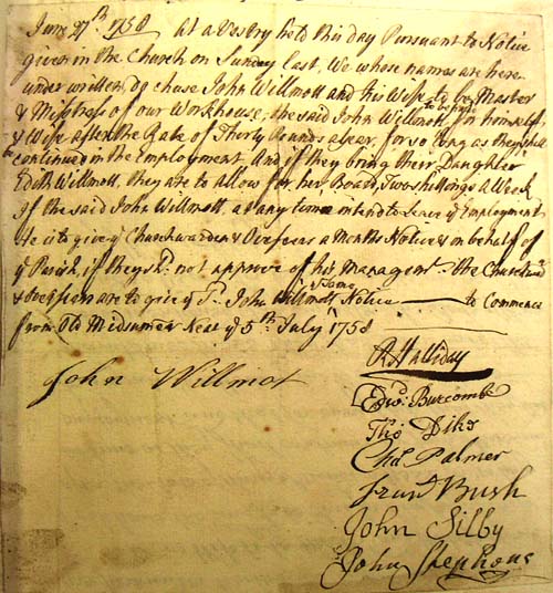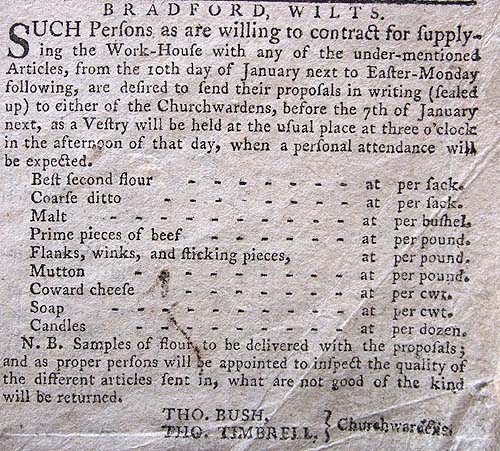 required to wear distinctive clothing. Under the Poor Law of 1572 a parish rate would be levied by the vestry and overseers of the poor. It was probably about this time that the leper hospital became known as the Catch. Jones writes: "In the year 1721 a resolution was passed in Vestry to purchase from Anthony Methuen, Esq., a portion of the ' Dutch Barton' in Church Street for a Parish Workhouse. Before that time there was nothing but ' out door' relief The Poor-house, as it was called, was afterwards removed to a spot close to the present railway station, the Vestry having resolved 25 June, 1754, ' to hire and take the houses called ' the Catch ' for the purpose of a Workhouse.' The premises were afterwards taken down for the construction of the railway, and the Workhouse removed to Avoncliff. In an account o lands and tenements belonging to the Prebendal Manor of Bradford in 1767 the premises are still described as " A house called ' The Catch." An insight into how it operated can be gleaned from a report in 1797 on the survey of the poor in England as follows: "In 1784 an Act was passed enabling the parish to appoint a general overseer, with a salary of £100. Mr. Rainer, a gentleman of considerable property, has always filled the office, but he accepts only £60 a year. The Poor are relieved at home, or maintained and employed in a Workhouse, which though old has been much improved by him. The apartments are now exceedingly neat and comfortable; the Poor are kept clean and well fed, but are made to work or are punished. If the Out-Poor are idle or get drunk, otherwise misbehave, or refuse to send their children to service at a proper age, they are ordered into the house. Badging the Poor is supposed to have reduced the rates. Mr. Rainer from his knowledge of law often prevents useless litigation; and, being well acquainted with the character and circumstances of every person who applies for relief, can discriminate very fairly between self-created and undeserved poverty".The Mr. Rainer mentioned is in fact Samuel Rainer who lived near by at 11 St. Margarets Street. The Course of diet in the Workhouse: Breakfast-every day, onion broth made of water, onions, oatmeal and fat of meat broth; no meat broth used. Dinner-Sunday, Tuesday, Thursday, meat and vegetables; other days, bread and cheese. Supper-every day, bread and cheese. 2lbs. of bread are allowed every day to those who work out of the house, and 1½lbs. to those who spin. Children receive a quantity proportionate to their ages. The cheese is not weighed". In the year 1841, the failure pf the local Bank and of several of the largest manufacturers threw hundreds out of work, and cast an abiding gloom over our town, the effect of which has hardly yet passed away. Then no less than 400 were forced to seek shelter within the walls of the workhouse, a number much beyond the capabilities of the then existing buildings properly to accommodate, and the limit allowed by law. Added to these, 300 able-bodied men were employed in out-door labour, in making roads or other parochial improvements. For the payment of these last-named poor persons, for some time no less than £70 was required weekly. Poor rates rose to ten shillings in the pound; distress was universal. Many noble efforts were made to meet the exigencies of the distressed weavers. An emigration fund of large amount was formed, by which many of them were enabled to seek in foreign lands employment which here was no longer to be obtained. By degrees others were helped on their way to Wales or to the North of England, or to other Peaces more in our immediate neighbourhood, that there they might earn subsistence by the labour of their hands for them- yes and their families. In 1835 the Poor House Commissioners authorized an expenditure of £3,000 on the purchase of an industrial building at Avoncliffe which was intended to accommodate 250 inmates. Finally the Poor House was demolished along with a number of old buildings when the railway cuttings were made after 1850. The site is today approximately where Keates Garage stands today. At Wimborne there is still a St. Margarets Hospital though its original role of a leper Hospital(it was founded in the 12 th Century)has long since dissappeared and it is now a homes for sixteen retired people, mostly from farming or rural backgrounds. |