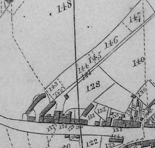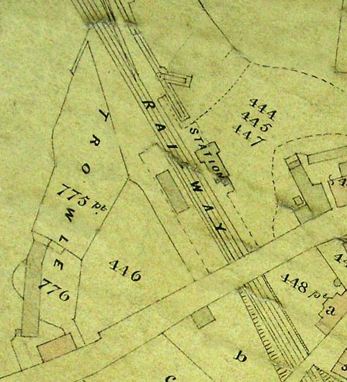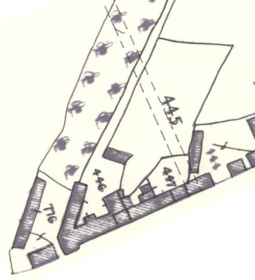 | The 1841 Tithe Map describes 445/446 as the Old Poor House, with John Forster as the Parish Officer (the dotted line is where the Railway would eventually go through).No. 447 is the "Cross Keys Inn"and two tenements.The painting by Mrs Elizabeth Tackle shows the side of no.776 with the plantation of trees stretching to the river. The adjoing building is probably part of the Poor House on the Frome Road . |