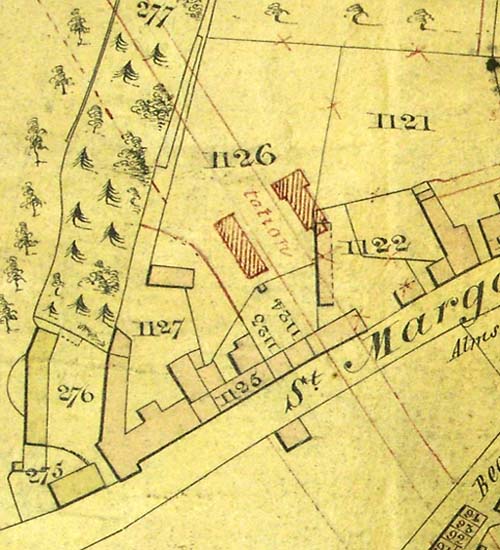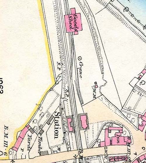 | The 1837 Ashmead Map of Bradford on Avon shows the Poor House (1127)with its outbuildings and grave yard behind it (1126). Someone has superimposed the station and tracks on to it in red after it was opened in 1857 |